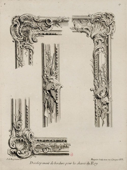 The ability of particular carvers [to design frames when required] does not rule out the participation of ornemanistes at other times. In 1730 the king had a huge canvas by Jean-Baptiste Oudry, which showed a hunt in the forest of Saint-German, installed in the château de Marly, and Sébastien-Antoine Slodtz carved a very grand frame for it, at the cost of 2,000 livres. Slodtz’s own talents in the matter of ornament might make one think him the author of the design for the frame, but its presence amongst the engravings of Juste-Aurèle Meissonier prove that the drawing was by him, as designer to the King’s Apartments [35].