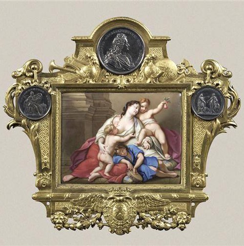 Charles Boit, Charity, enamel plaque, with frame by Jean Le Blanc, gilt bronze, 1718, Musée du Louvre