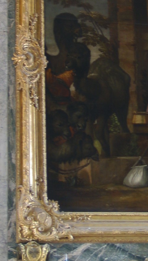 The principal paintings in displayed in Louis XIV’s various residences throughout the 18th century were given very beautiful frames. However, only La chasse and La pêche by Carracci still possess (or, more exactly, have regained) their original frames, decorated with ornaments eloquent of the beginning of the century [40]. Without being accurately dateable, they exemplify the type of frame which was preferred for the royal palaces. The corner cartouches are still not too emphatic. and the overall design of the frame does not highlight the individual parts which later years would focus on. The Louvre still possesses very many of these frames in the royal style, which suggest that a campaign of framing and reframing was carried out during the period 1710-30. It may also be the case that a number of these frames were commissioned for the exhibition of the most beautiful of the King’s paintings at the Hôtel d’Antin in Paris, at the beginning of 1715. Carracci’s La chasse and La pêche certainly appeared there; Correggio’s Mystic marriage of St Catherine was temporarily stored at the Hôtel d’Antin, and has a frame which might well date from the period [41]. The decoration of the frames on La chasse and La pêche takes the form of unbroken ornament, with no interval of unadorned wood; it also includes the trellis-like background known as ‘diapering’.
