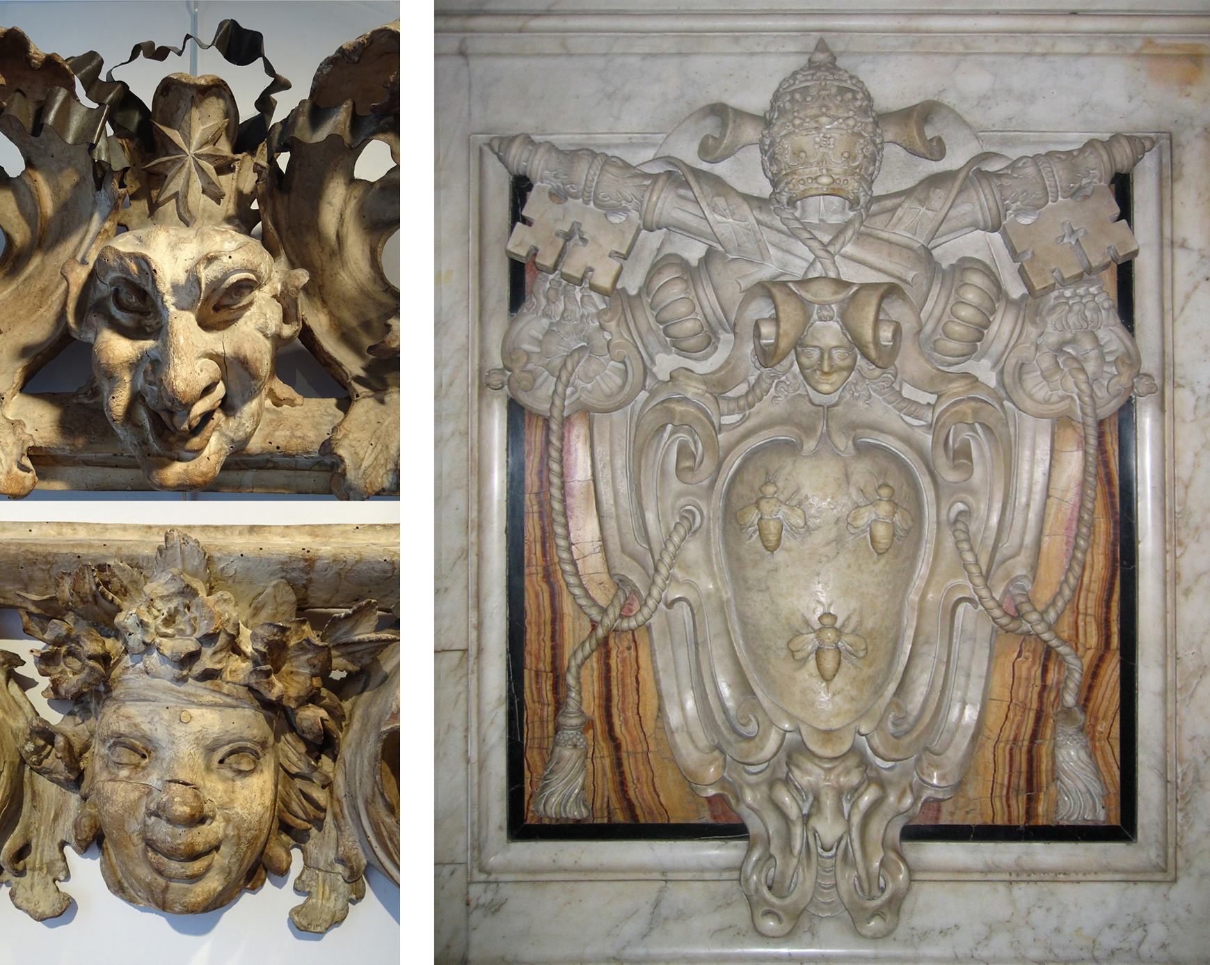 Mascaron & mask (left); plinth of Bernini’s baldacchino (right)
