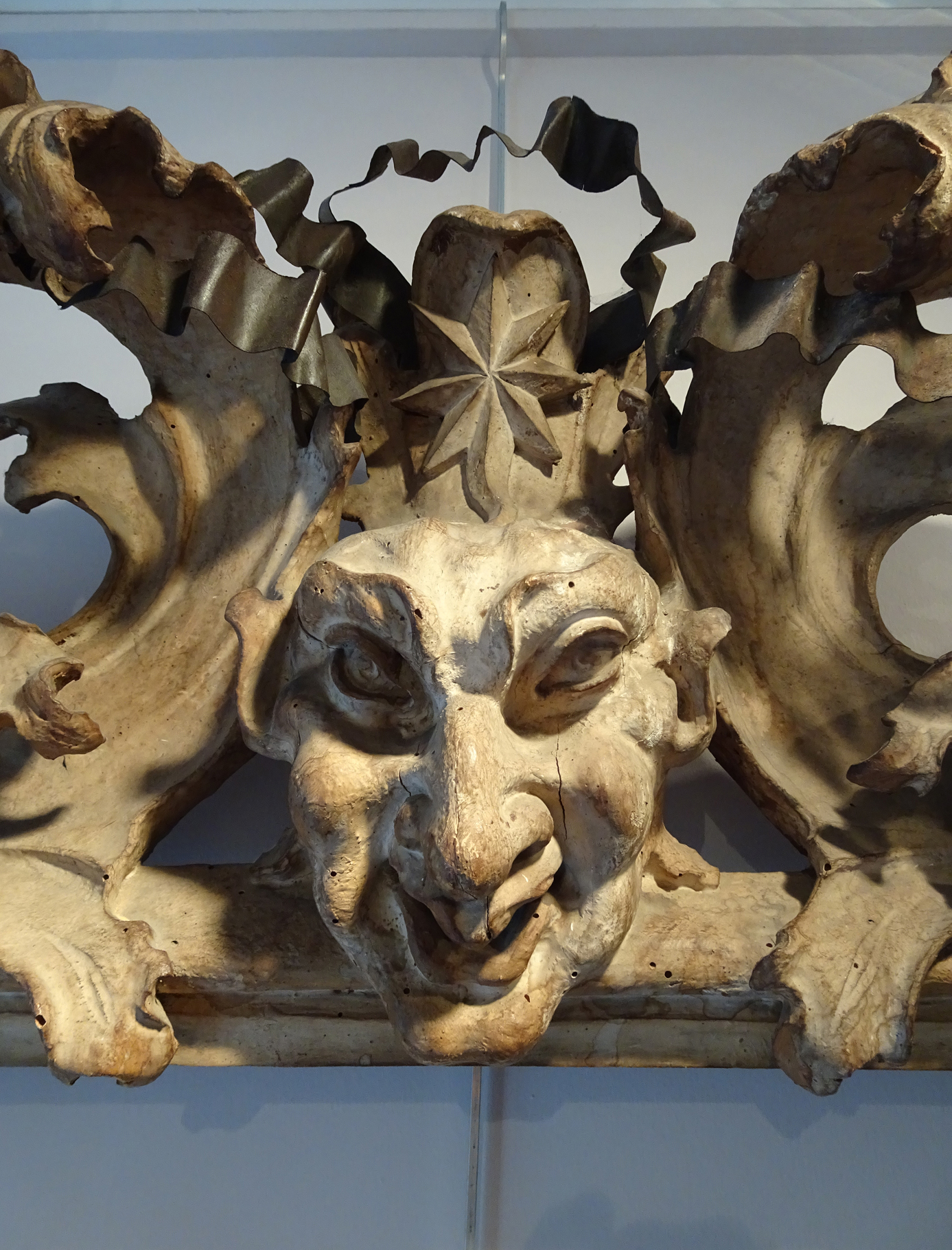 In order to explore what this might mean in relation to the carved masks, it is necessary consider various possibilities regarding the location and function of the frame(s) in a Baroque palace or villa; and here the finish is important. Unlike the other examples of Chicari’s work mentioned above, and unlike the frame on the Baldi Ecstasy of Santa Rosa, the mascaron frame is not gilded, but finished with a wash of stone or off-white paint which remains in remarkably good condition, especially where protected by the undercutting of the leaves. This sort of finish, imitating a plain pale stone, would not have fitted into the decoration of the state apartments in a Baroque palazzo, where the materials used were richly-coloured pietre dure, gold, precious woods, silks and velvets, or painted faux marbre.