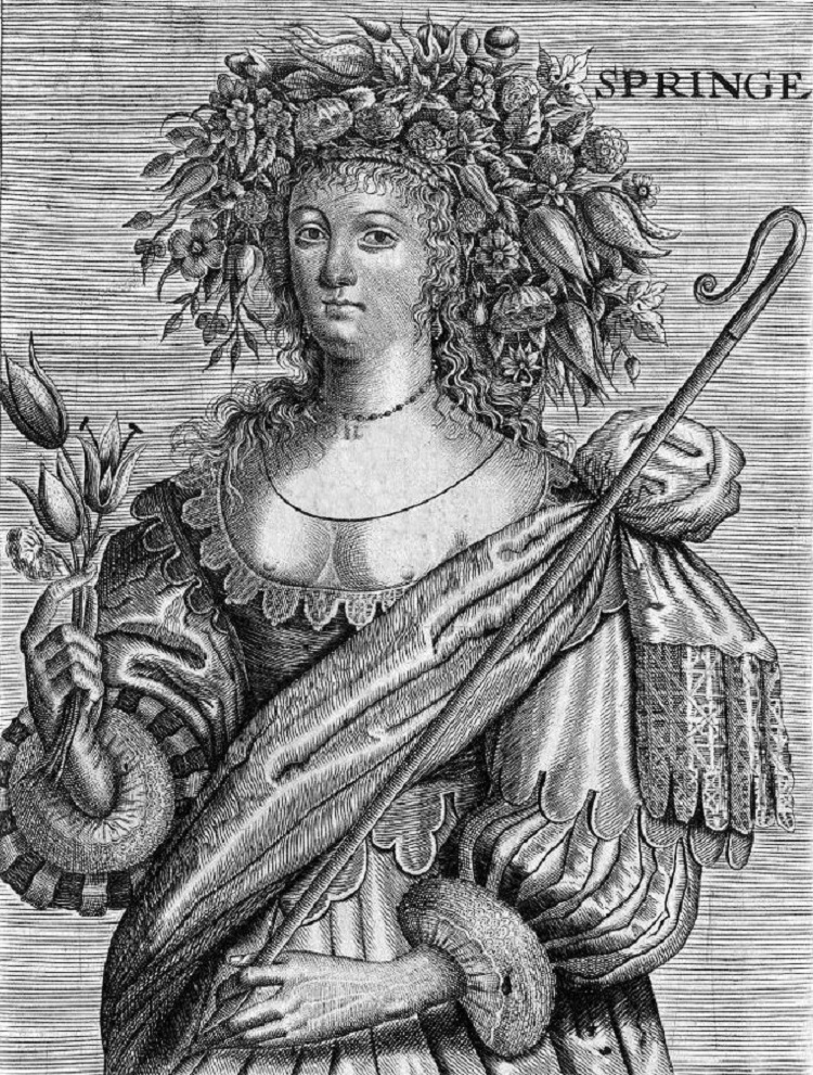 Personifications like these were frequently disseminated by engravings, often from the Netherlands or the north, such as in this early 17th century English engraving of Spring. The possibility that the mask on the frame does represent Spring is supported by the bunches of daffodils and narcissi carved at the top, and makes it less likely that two seasons (Summer and Spring together) are intended. Summer was generally depicted with sheaves of wheat, Autumn with grapevines, and Winter with fire.