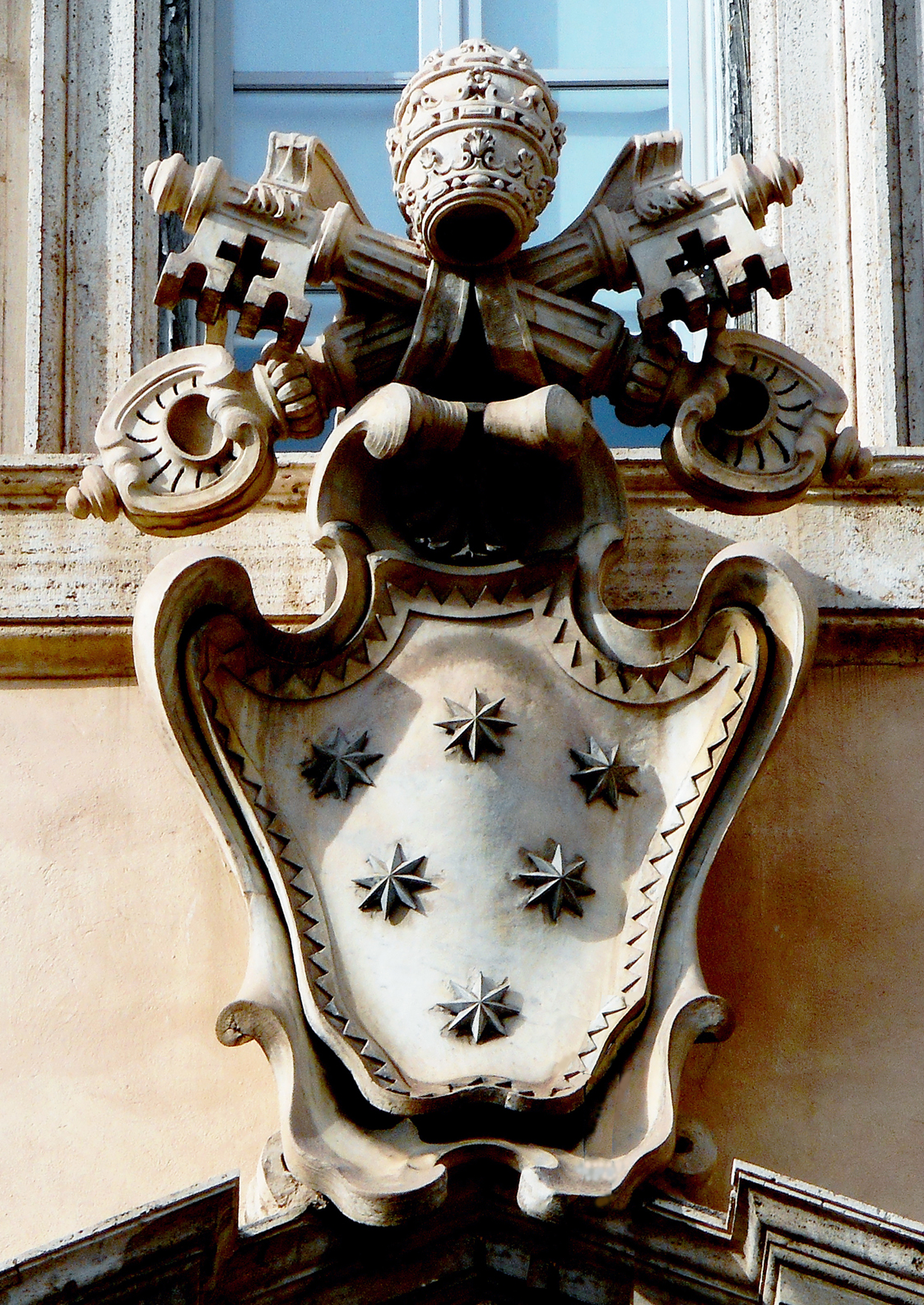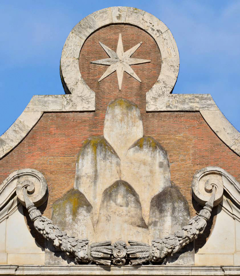 It is also notable for the emblem at the top; the faceted eight-pointed star on the leafy top-knot of the central mascaron. This may perhaps be the emblem and part of the impresa of the Chigi family, which together consisted of a pyramid of six hills with a star above and the motto, ‘shining at the summit’ (micat in vertice).