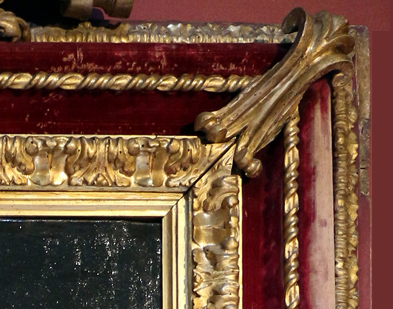 The carving is finely executed, and is an exceptionally rich variation on the ‘Salvator Rosa’ gallery frame, opulently enriched with velvet to match the papal robes in the suite of portraits. Like Gaulli, who was an artist in Bernini’s train, and was given his great opportunity through the latter’s support (decorating the vault of Il Gesù, including the nave and dome, at the age of 22), Antonio Chicari worked in the orbit of Bernini, carving frames, furniture, and (apparently) carriages to his design or to those of his followers.