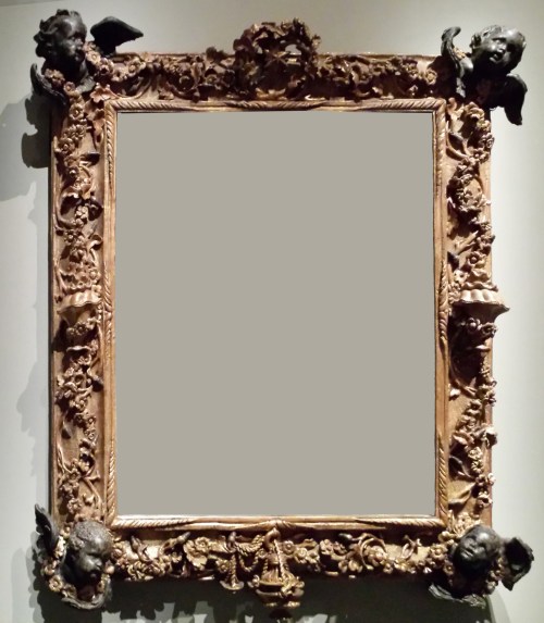 This frame in the Liechtenstein Collection is also credited to Chicari, and described as ‘probably made to a design by the sculptor Gian Lorenzo Bernini’ [2]. This reference to Bernini is based on the cherubs’s heads, which are carved completely in the round, individualized and full of movement. The main body of the frame consists of a wide flat frieze, which would be the reverse of Baroque in its lack of differentiated profile, save for the three-dimensional quality of the carved ornament.