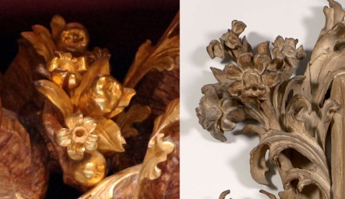 It is a frame remarkable for the intensely sculptural and plastic quality of its design, and the vigour and animation of the carving. The relative simplicity of the underlying structure (two branches holding the inner frame), coupled with the complexity of the intertwined and radically undercut leaves on those branches, indicate that the master carver who made it, and – if he did not also design it – the architect or ornemaniste who produced the drawings for it, were both important and adept within the development of Baroque sculpture.