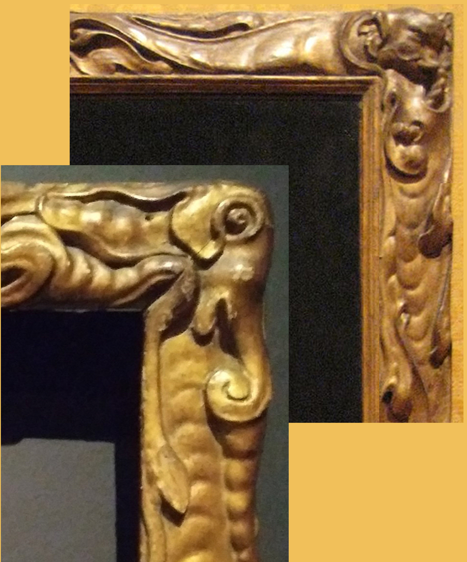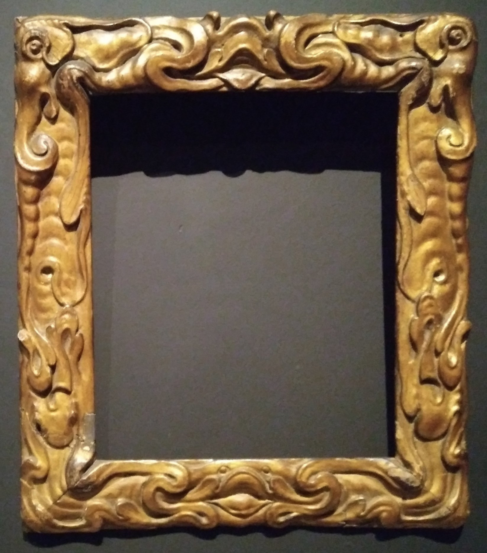 Framemakers themselves had a wide array of materials to choose from at this point, since ebony workers like Herman Doomer were changing the variety of woods in vogue for both frames and furniture. For Auricular designs, however, a much softer type of wood than ebony or oak was necessary: something relatively easy to carve and which could imitate the melting forms of Auricular silverwork. For these the framemakers usually preferred to work in limewood, which is quite soft, with a short grain that is excellent for carving the soft and bulbous shapes required. The exhibition shows one especially fine example of an empty Auricular frame from the Rijksmuseum’s own collection. All the motifs in this frame are evocative of marine shapes and sea creatures, with fish- and frog- like masks at top and bottom – although the top corners are carved into elephants’ heads, the trunks transmuting into scrolling spiral shells.