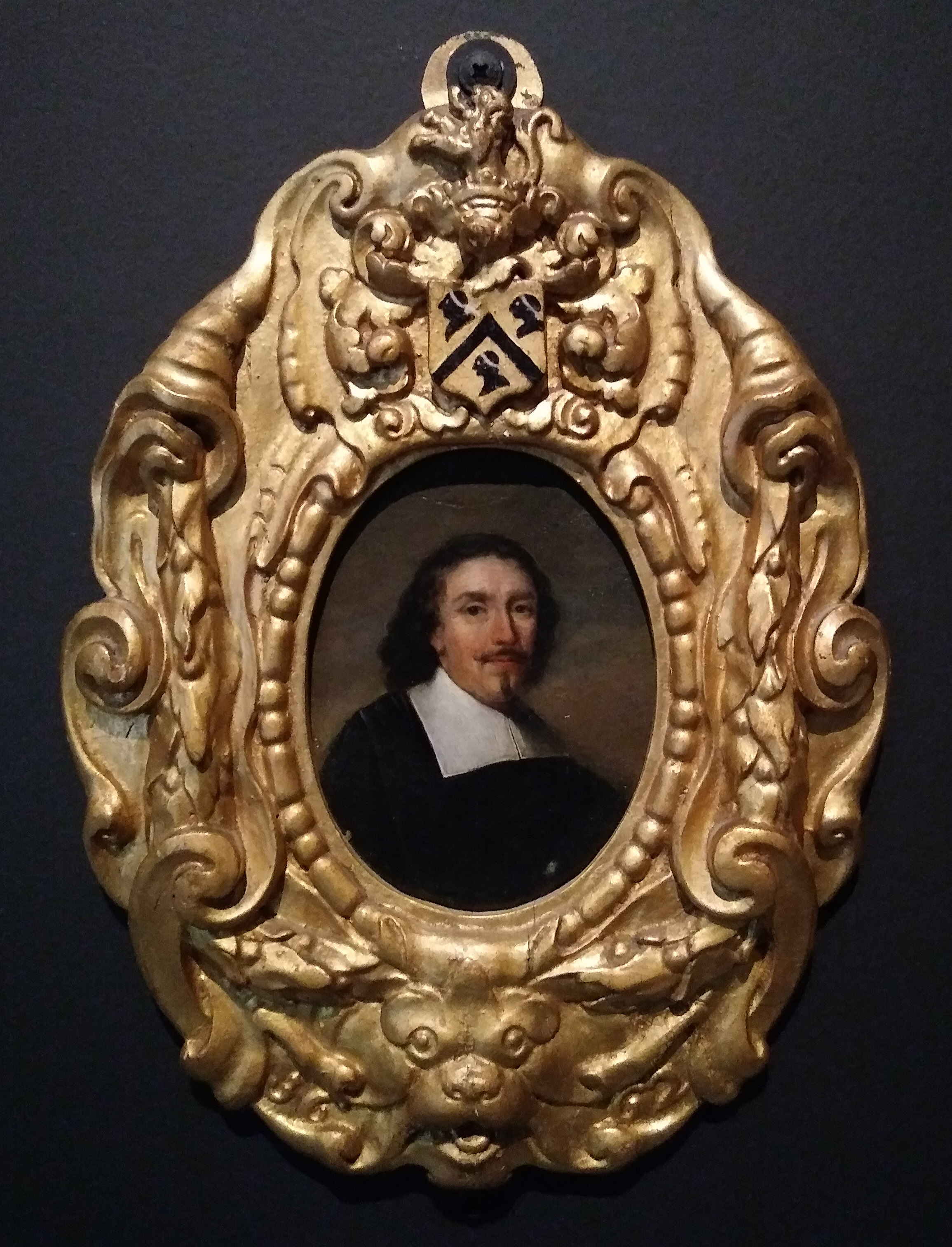 Unknown painter, Portrait of Nicolaes van der Merct, 1662, oil on copper, 11.5 x 8.7 cm.; unknown framemaker, oval Auricular frame, 1662, gilded limewood; private collection, Germany