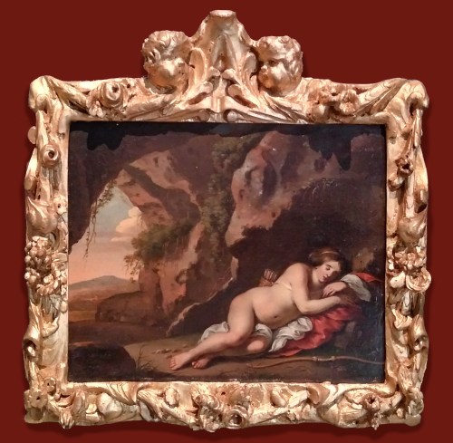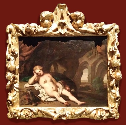 Gerard Hoet, Sleeping nymph in a cave, lying on the right, Amsterdam, 1674, oil/panel, 13.2 x 16.6 cm.; unknown framemaker, Auricular frame, Amsterdam, 1674, gilded limewood; & above, hanging in Petronella de la Court’s dolls’ house; Centraalmuseum, Utrecht
