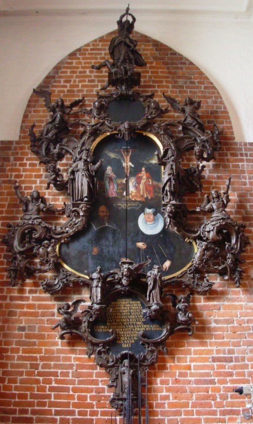 Hans Gudewerth the younger, Epitaph for Heinrich Ripenauw, Eckernförde, c. 1650-1651, oak, painted brown around 1880, with paintings, painted with oil on panel, 340 x 175 cm., Evangelisch-utherische St. Nikolaikirche, Eckernförde