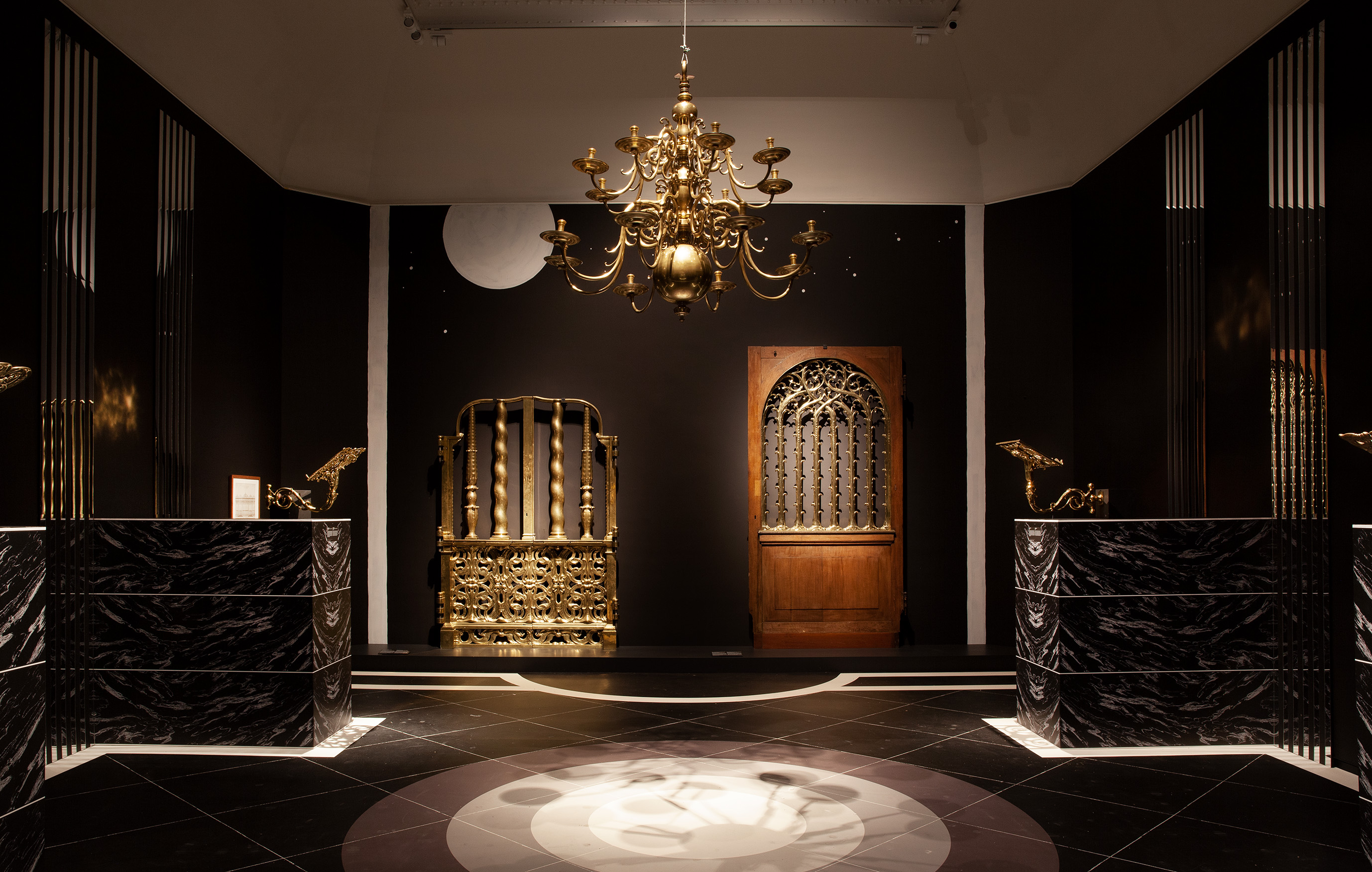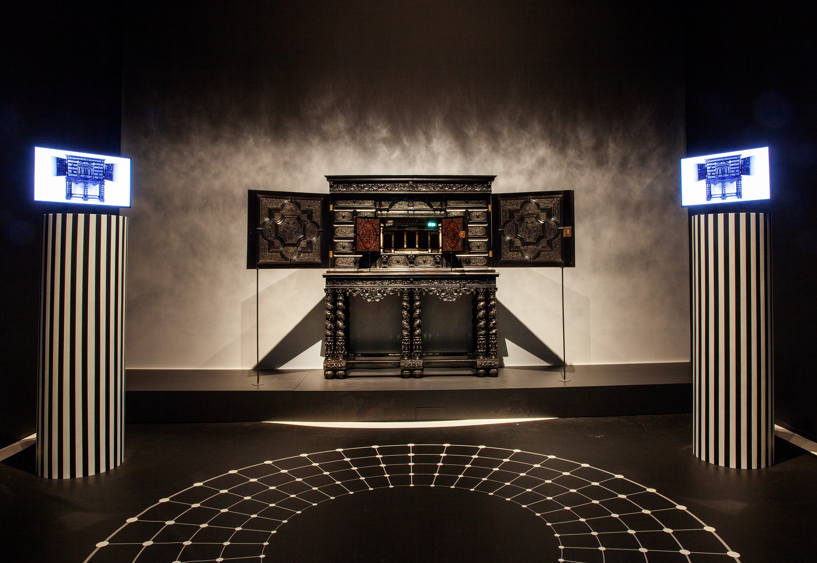 Publicity photo from the exhibition showing, centre left, one of the gates from the choir screen of the Nieuwe Kerk, Amsterdam, by Johannes Lutma, c. 1650, brass