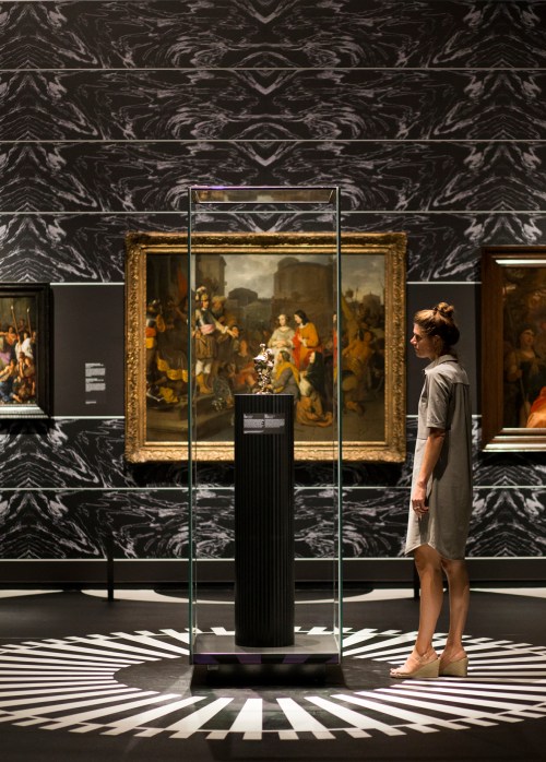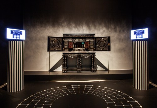 …and from these columns it’s a small step to the exhibition designer, Keso Dekker, who deserves an honourable mention. He is widely acclaimed as a designer for ballet and dance theatre productions, and has come up with a setting for this exhibition which cannot be overlooked; the graphic quality of his work offers a striking contrast to the 17th century Auricular.