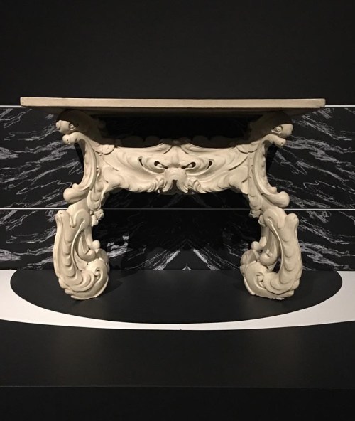 The last room is reserved for one of the very rare pieces of French Auricular furniture. As a style it seems to have been a bit too much for the French taste, and it never achieved quite the popularity it did in The Netherlands, Britain, Germany or Sweden: see Marika Takanishi Knowles, ‘Who’s afraid of the French Auricular?’. However, this Parisian cabinet, on loan from Stockholm, is decorated in full Auricular style. It is displayed in a room with four columns, each carrying a screen depicting detailed images of the cabinet; the video can also be seen here. The columns are decorated with black and white stripes, reminiscent of the columns of Daniel Buren in the Cour d’Honneur in Paris…