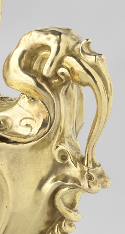 Adam van Vianen, ewer with lid, 1614, silver gilt, detail of lizards inside the bowl; detail of handle