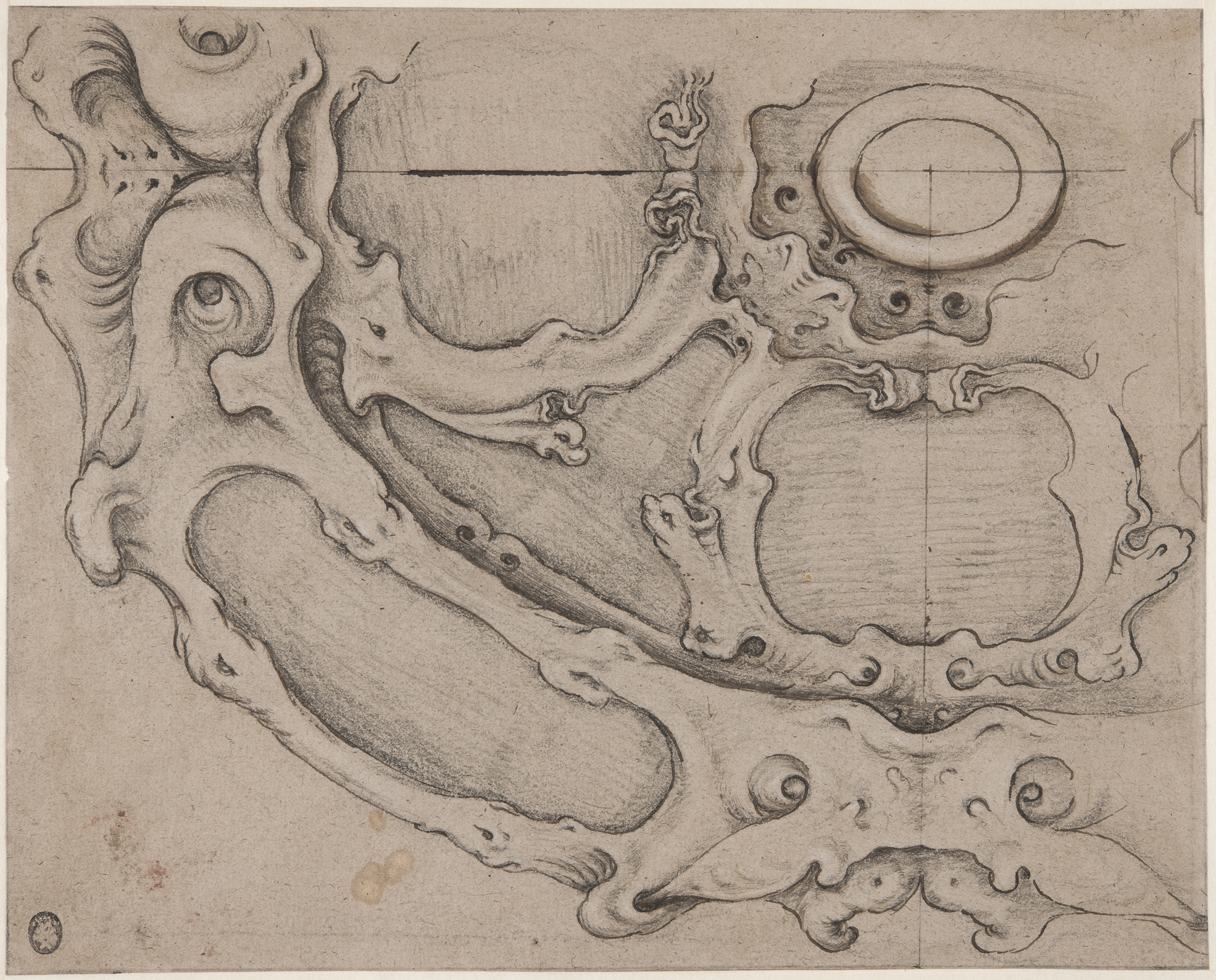 Adam van Vianen (attrib.), design for a basin, Utrecht, c. 1610-27, black chalk, pen & brown ink on grey paper, 23.4 x 28.9 cm., Nationalmuseum Stockholm