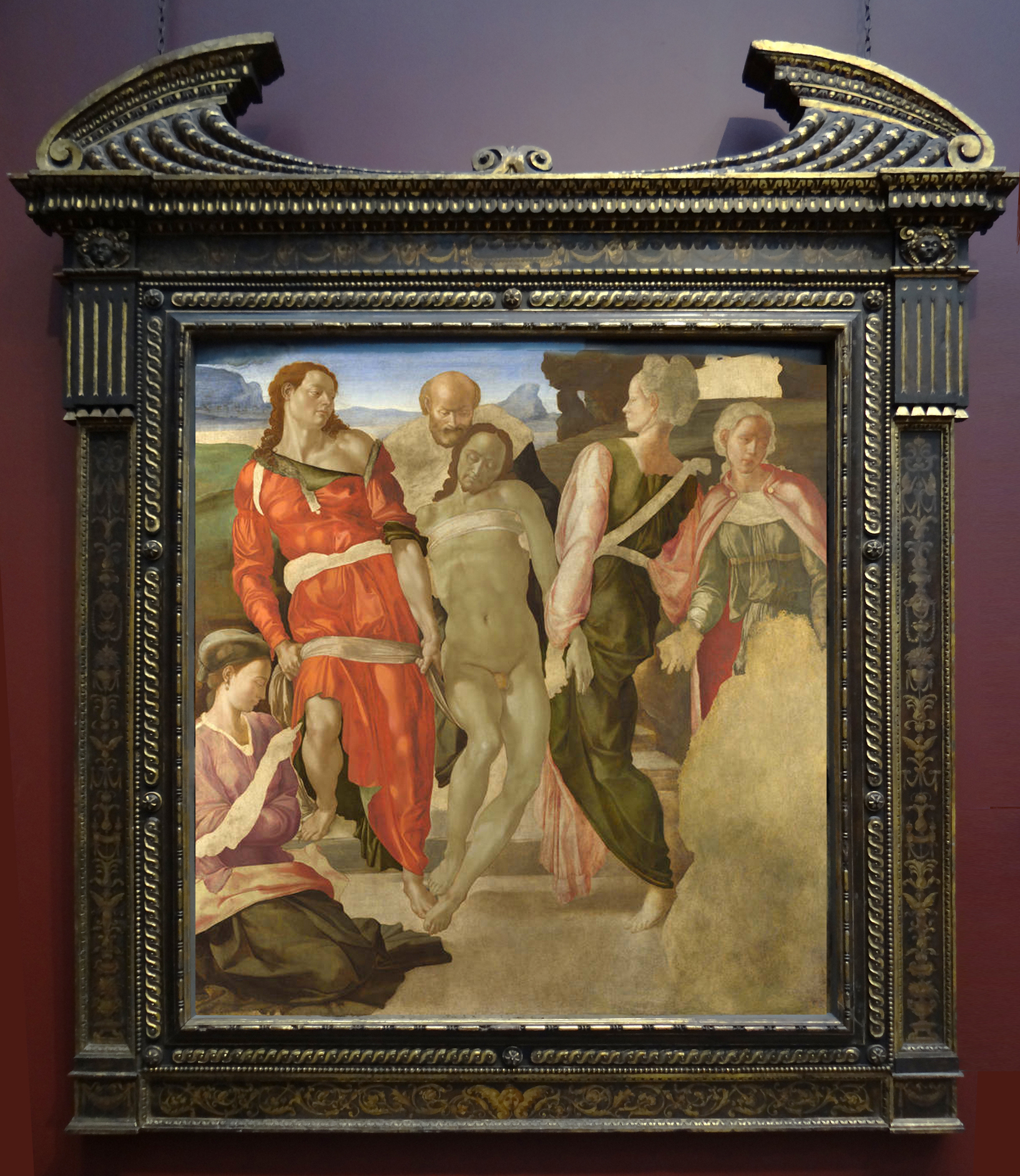 Once in the National Gallery it seems to have been given an antique frame, which had to be altered or perhaps have missing pieces replaced and also needed to be regilded, since the diary of Ralph Wornum, Keeper of the Gallery in 1856, noted on 11 April that it was ‘hung in the west Room… Frame ornamented and regilt’ [10]. This was done by the framemaker Henry Critchfield, who worked for the National Gallery from 1854-80. In 1922 it was given a plain gilded moulding frame with an inlay by the framemaker of the day, Francis Draper junior  (which made it look like a poster); but in 1946 the framemaker F.A. Pollak, who also dealt in antique frames, produced two stunning examples, one of which the Gallery bought for Michelangelo’s Entombment , and the other for Mantegna’s Virgin & Child with saints.