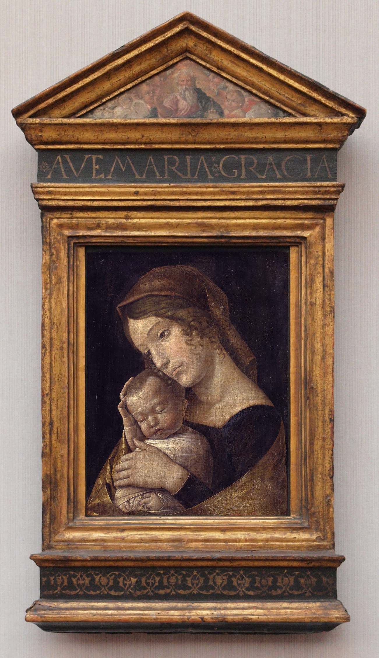 Probably because of such integral classicizing frames (of which Michelozzo’s is an early example), those relief panels which had no border at all began at some point to acquire wooden frames in the same style – mainly quite plain, with no more ornament than a fluted Corinthian pilaster. There is a collection of reliefs in the Bode Museum, Berlin, framed in variations of this type, with flat entablatures, round-arched tops or triangular pediments.   Given the monumental effect of Mantegna’s painted Madonna, the narrow range of colours, and its general similarity to a carved shallow relief plaque, the choice of a classical frame of this kind – with a painted image of God the Father in the pediment and the inscription, ‘Ave Maria gracia’ (Hail, Mary, full of grace) – could hardly be bettered; and the inlay added at both sides to fit frame to panel is almost unnoticeable. The debt of the composition to Donatellesque Madonna plaques is underlined, at the same time that Mantegna’s painting reaches beyond a sacred image to the depiction of a real mother.