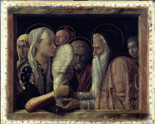 Another painting which shares something of the monumental in its effect, and which has also been compared to a relief by Donatello – this time to the autograph version of the Pazzi Madonna – is Mantegna’s Presentation in the Temple. As the catalogue points out, the Pazzi Madonna