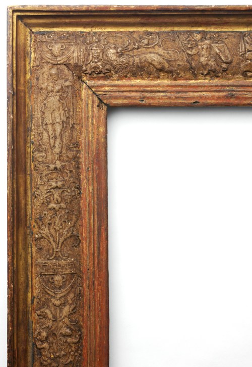 A good example of a relatively untouched frame with the same moulded ornament of grotesque creatures, winged or classical figures, arabesques and cartouches, is the frame above, in the V & A. The decoration is made from two different moulds, one for the top and bottom rails and one for the two long sides, and the museum entry for the frame describes it like this: