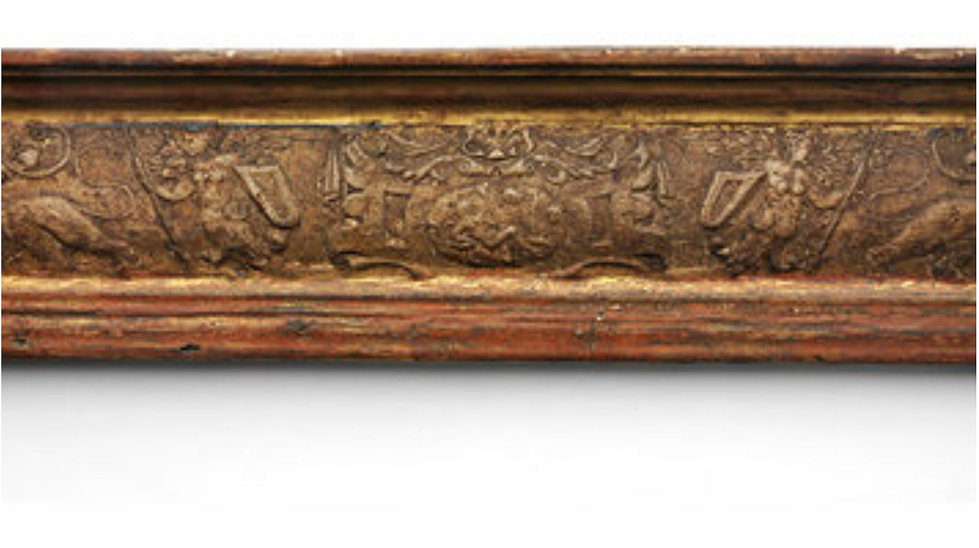 ‘A wooden frame would then have been attached to the front face of the strainer, covering the tacking margin.  A ridge of gesso covered with original paint can be seen around the perimeter of the painted image, which confirms that the frame mouldings were prepared with gesso and painted at the same time as the picture.’ [15]