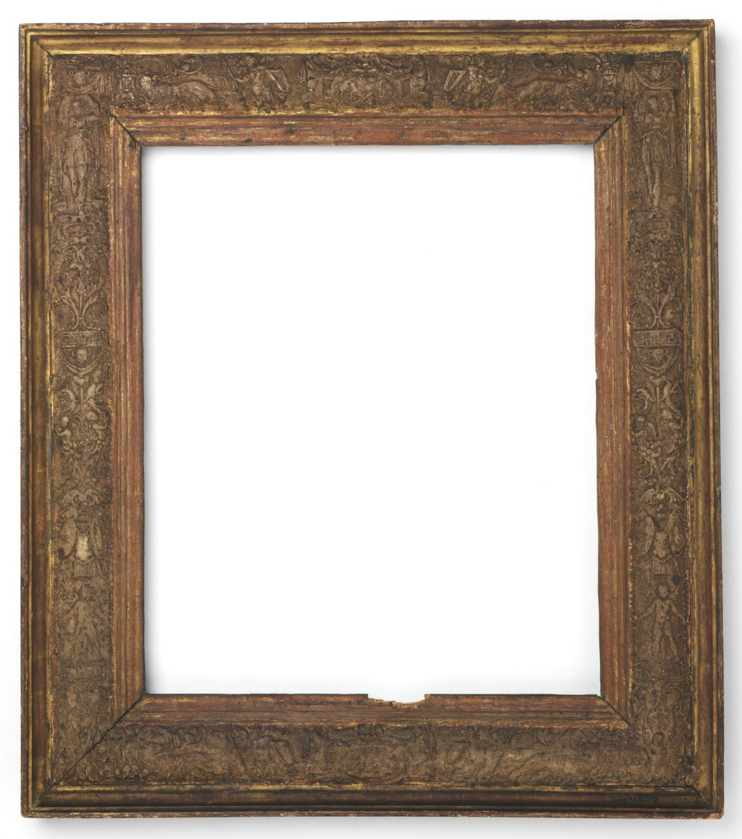 This huge framing device was made in the workshop of one of the most famous London framemakers and dealers – Paul Levi, who helped to recreate an interest in antique picture frames in Britain in the teeth of minimalism and modernism.  It dates from the last quarter of the 20th century, and it is not an accurate reproduction of the original frame but a re-imagining of what the frame might been, based on contemporary knowledge, and possibly made by assistants rather than by Paul Levi himself.