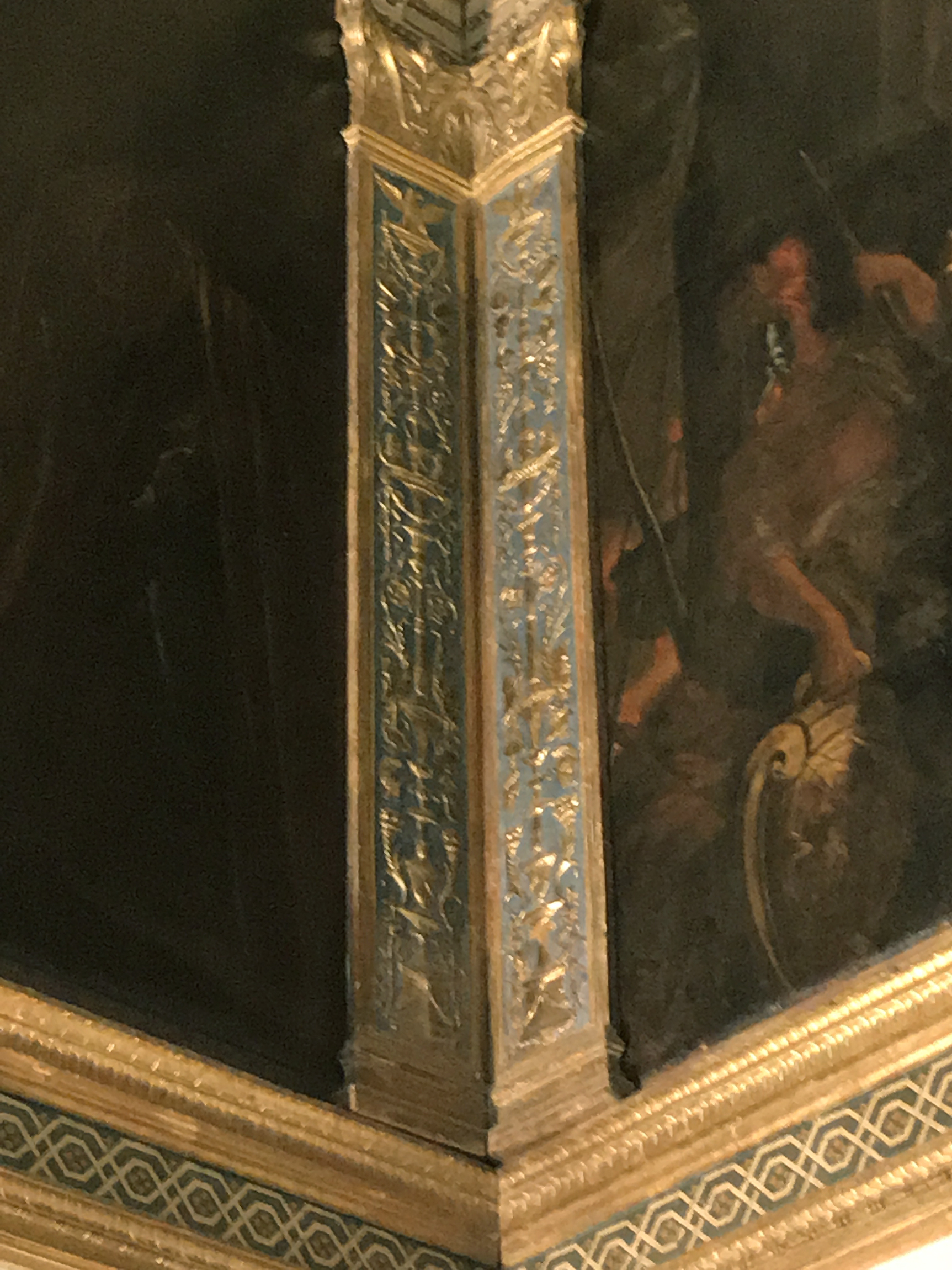 It is hard to believe that a Renaissance craftsman would go to the trouble of obtaining or making such complex moulds, and then use them in such a careless way; possibly the Getty frame has been ‘improved’ in the 19th century, or has had its decoration recreated from a single mould. Bellini’s Christ blessing in the Louvre has an even more undiscriminating use of the moulds, since  – whilst the top rail has the sideways figures centred, and running right and left to the corners – the bottom rail has a single strip of ornament running from left to right.