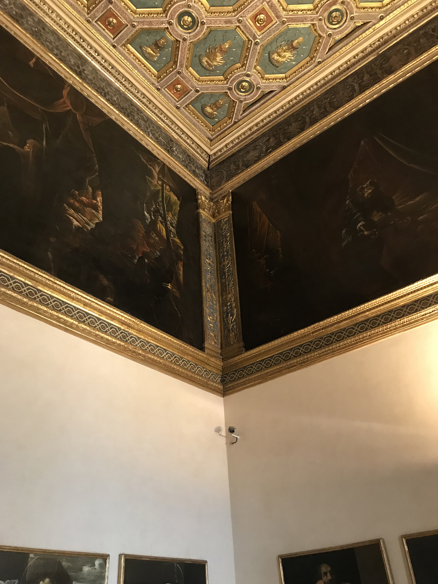 Meanwhile, some of the original pilasters which held the cycle of The triumphs of Caesar in the Palazzo di San Sebastiano – part of the town-sized palace complex of the Palazzo Ducale, Mantua – have been salvaged from their first location and installed in the Stanza di Giuditta, along with a coffered ceiling from elsewhere. These were photographed by Peter Schade (with some difficulty, as they are now high in the air), and used to create drawings in the National Gallery workshop for an authentic pilaster frieze.