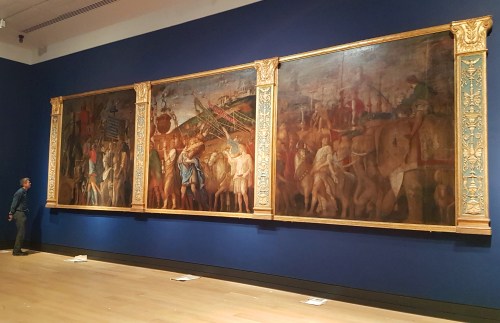 In contrast, the grandest and perhaps the most striking reframing of Mantegna in the exhibition may be, sadly, the most temporary. Earlier in 2018 (January to April) the exhibition Charles I: King & collector took place at the Royal Academy, and the nine canvases of Mantegna’s Triumphs of Caesar were shown on three walls of a single gallery, let into massive dull greyish-blue mounts, like some great multi-screen Renaissance video display. This effectively killed all the vibrancy and animation of the paintings completely dead, and made this probably the least lingered-in room of the whole, otherwise stunning, show (strangely, they look more colourful in reproduction).
