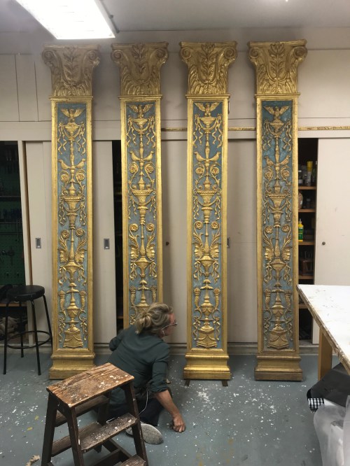 Original pilaster from the Palazzo Ducale, Mantua (left); replica pilaster in National Gallery workshop, prepared for gilding; carving by François Loudwig