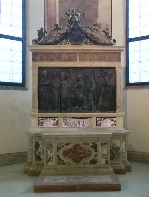 The genesis of Mantegna’s frame has been traced to two connected works, firstly to Donatello’s altar in Sant’ Antonio, Padua, with its bronze figures of the Madonna and six saints, the four Evangelists and angels, most of which survive in their original church: although the containing structure and outlying pieces, such as Christ in a sepulchre – all of which Donatello sub-contracted to various stone carvers, a Venetian woodcarver (for the sepulchre), metalworkers and goldsmiths, and a painter – were dismantled in 1591 [1]. Secondly, to the terracotta altar by Nicolò Pizzolo and others, in another Paduan church, also seen as a predecessor of the San Zeno altarpiece; it has similarly suffered damage, this time in the last war, and is shown below with the missing elements restored [2]. Pizzolo is, as it were, the link between all three altarpieces, in that he was one of Donatello’s assistants between 1443 and 1453, when the High Altar of Sant’ Antonio was being executed; and he was also one of the group of artists, along with Mantegna, which was commissioned to work in the Ovetari Chapel  of the chiesa degli Eremetani in 1448. Pizzolo was at that point about twenty-seven, and Mantegna was seventeen. They were both contracted to paint a fresco cycle in the chapel, and also apparently to work together on the altarpiece: