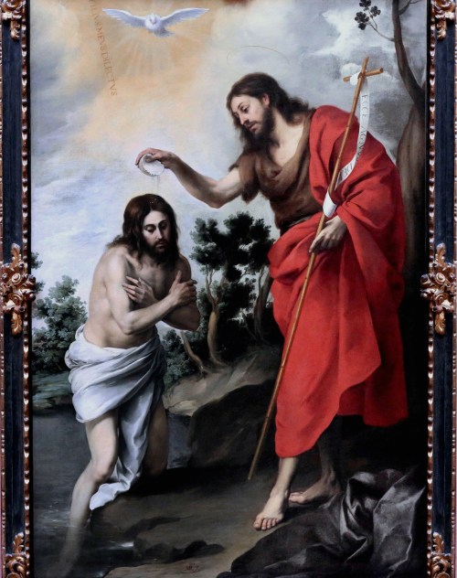 Bartolome Esteban Murillo (1618-82), The baptism of Christ, c.1655, o/c, 91.8 x 63 ins (233.2 x 160.1 cm.), Gemäldegalerie, Berlin; detail of Spanish frame with running gem ornament at sight edge, and leaf & scrolling flower corners & centres