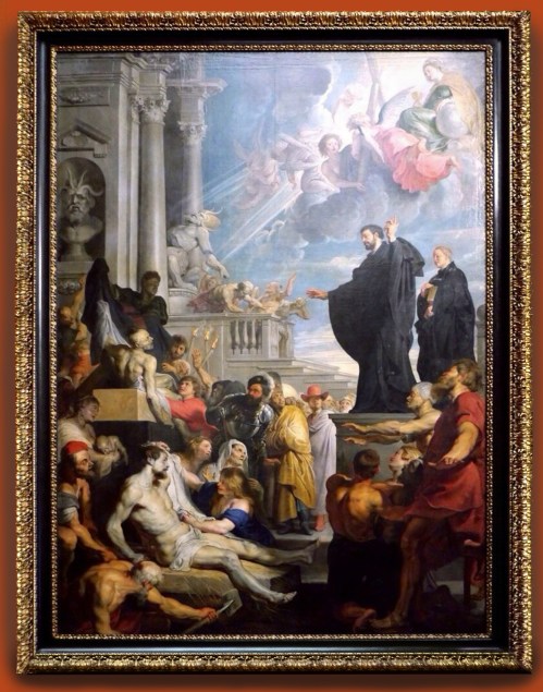 Peter Paul Rubens (1577-1640), The miracle of St Ignatius Loyola, c.1617-18, painted for the Church of St Charles Borromeo, Antwerp; now Kunsthistorisches Museum, Vienna, in a Baroque parcel-gilt frame: compare this with the companion altarpiece returned to its position in the church, above