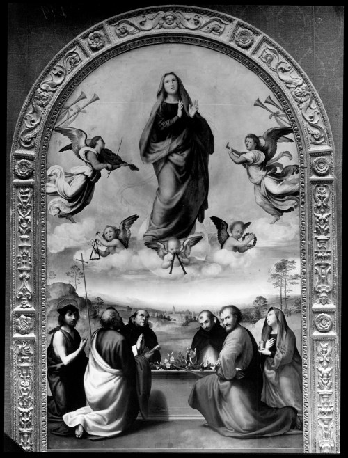 Raphael (1483-1520), Madonna & Child with saints, 1502, o/panel, Gemäldegalerie, Berlin; tabernacle frame with donor shield in the apron