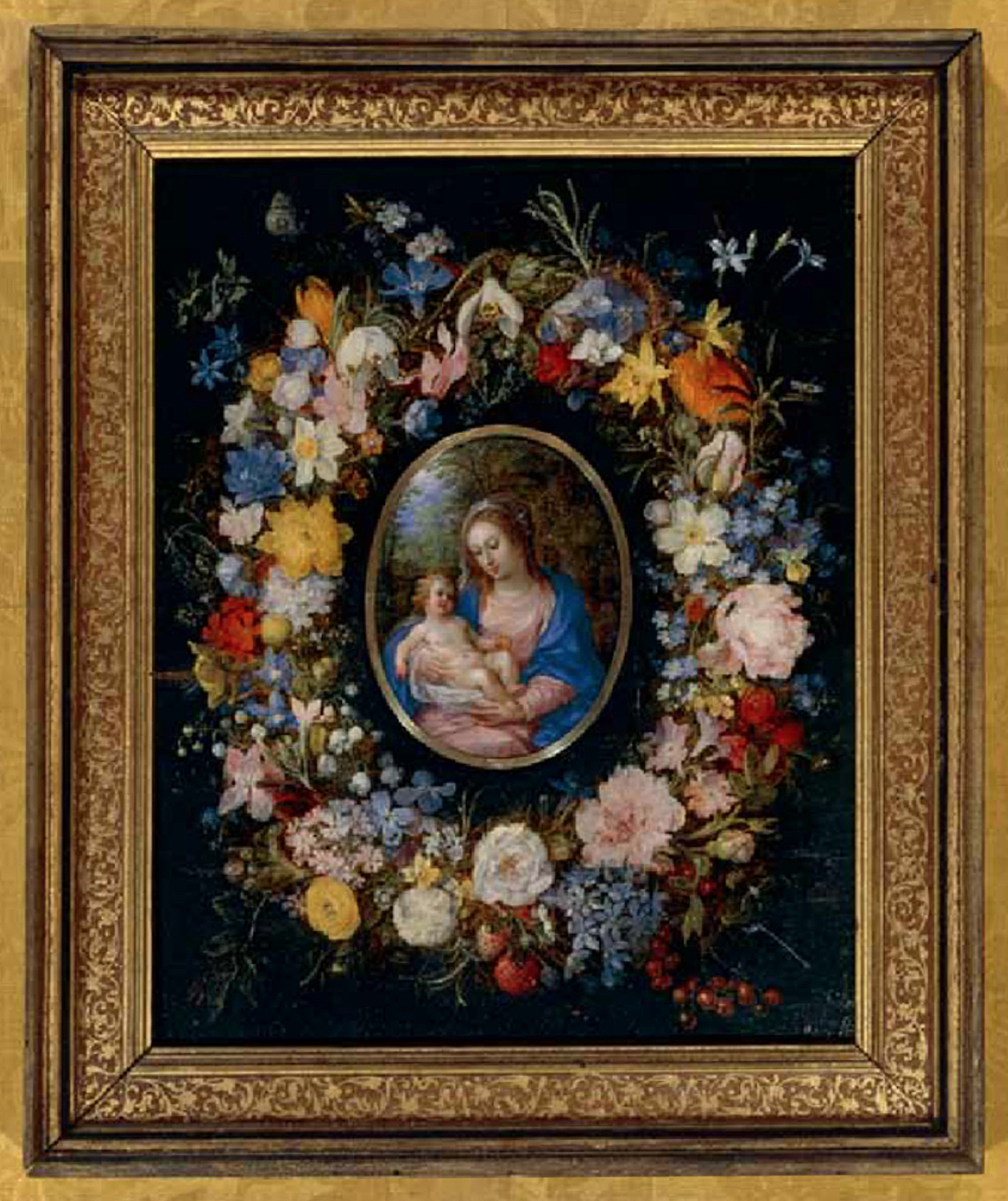Jan Brueghel the Elder (1568-1625) & Hendrick van Balen (1575-1632), Madonna & Child in a garland of flowers, 1608, o/ panel, 27 x 22 cm., Pinacoteca Ambrosiana, Milan; cassetta with scrolling foliate sgraffito ornament in a painted brown frieze