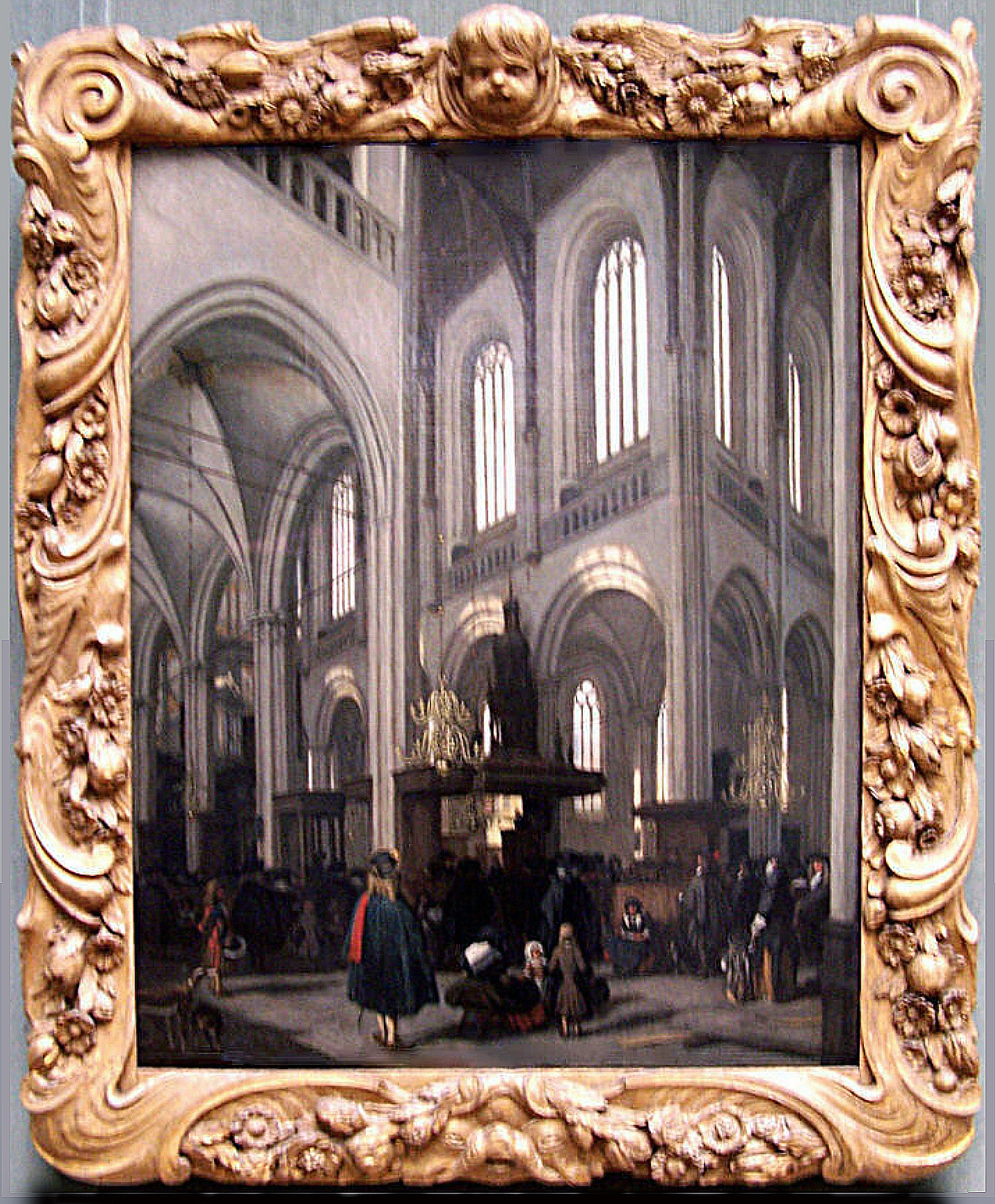 The common type of border for panel paintings in the Spanish Netherlands was a black moulding frame (apart from altarpiece settings, or decorative pictures set into panelled walls, with a tapestry-like effect). Like the Interior of a Gothic church by an unknown Antwerp artist of 1620 in the Nationalmuseum, Stockholm [6], even large and important works by Rubens were given simple black mouldings, which were probably chosen in the place of a gilded frame so that they would stand out against rich golden tapestries. The designs of giltwood frames (in the few cases where the originals survive on Flemish cabinet pictures) derive first from Italian sources and later on from French Louis XIV models.