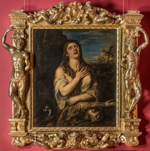 Amongst the picture of the Hermitage which have retained their original frames are the Danaë and Penitent Mary Magdalene by Titian (above), which were once part of the famous collections of Croz and Barbarigo, purchased by Russian emperors. The carved gilt frame of the Danaë is a typical example of Louis XIV style. The frame of the Mary Magdalene is a unique piece of work by Venetian masters of the late 16th century. It was commissioned by Cristoforo Barbarigo, who wished to present the Titian in a particular way and emphasize its inherent belonging to his family. The decor of the frame, which includes six naked male figures, is connected with the family legend of Barbarigo.
