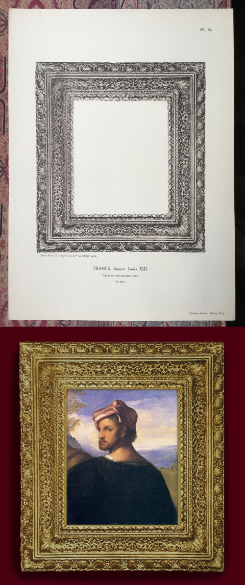 Plate 9 of Cadres français et etrangers…: ‘Epoque Louis XIII: Cadre en bois sculpté doré; 73 x 60, t.’; and montaged with Titian (fl. c.1506-d.1576; previously attrib. to Giorgione), Head of a man, c.1508-10, 47 x 40.5 cm., Kelvingrove, Glasgow