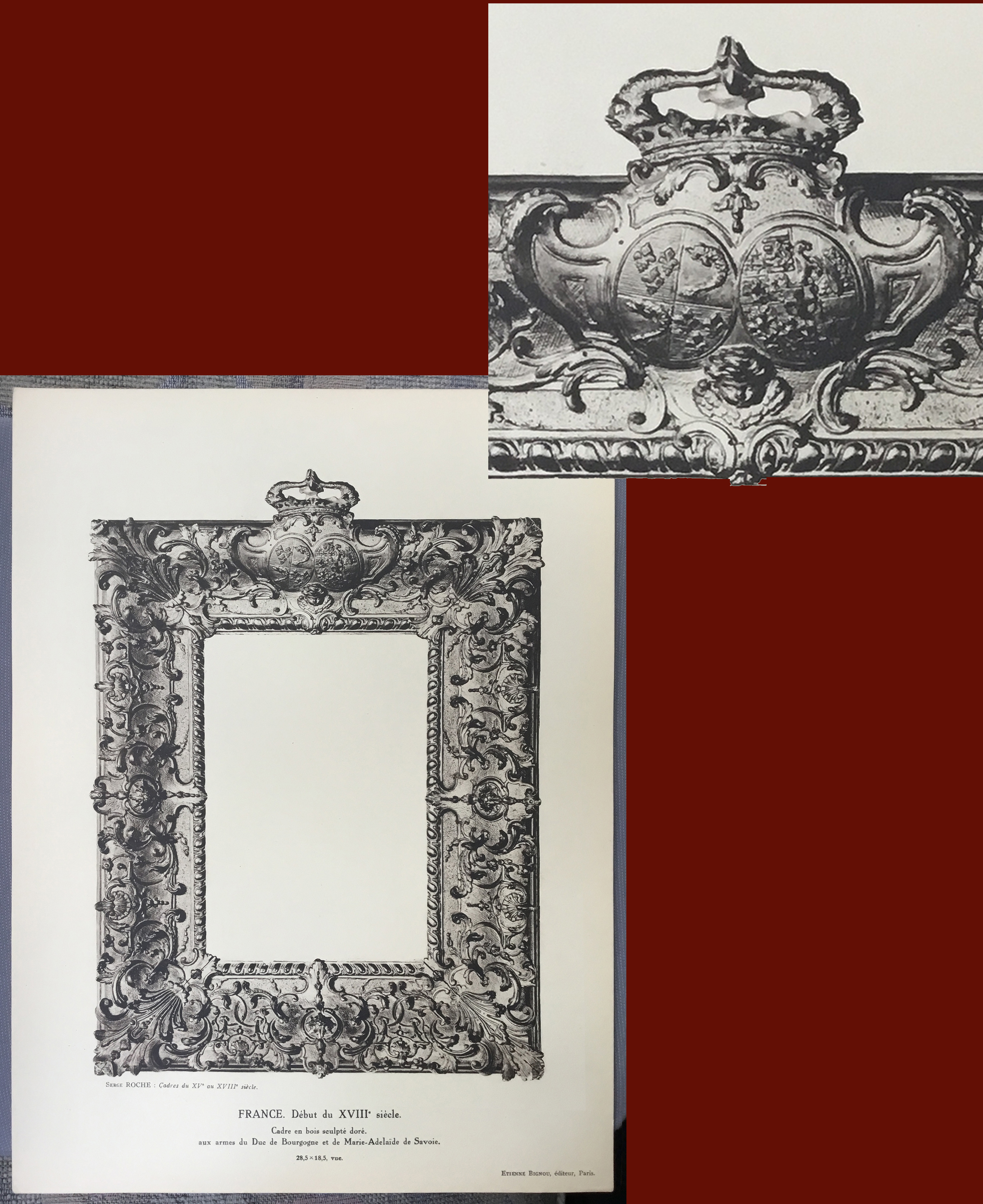 Plate 22 of Cadres français et etrangers…: ‘Début de XVIIIe siècle: Cadre en bois sculpté doré aux armes du Duc de Bourgogne et de Marie-Adelaïde de Savoie; 28.5 x 18.5, vue’, and detail