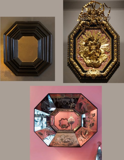 Top left: 17th -18th century ebonized octagonal looking-glass, Netherlandish or (?) Italian; top right: Alessandro Algardi (1598-1654; after), Virgin & Child, c.1750, Bologna, V & A; bottom: Serge Roche (1898-1988), octagonal looking-glass with fantastic animals, probably by Max Ingrand (1908-69), 1933, ex-Galerie Chastel-Maréchal