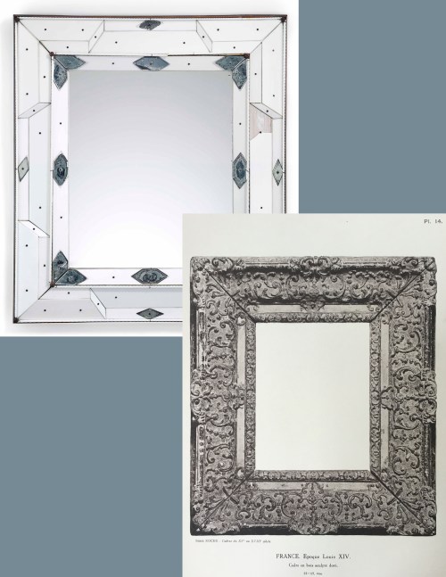 For example, this 17th century Louis XIV frame, with its gentle ogee profile and calligraphic foliate C-scrolls carved in shallow relief and gilded, may look light years away from the mirrored glass frame of the looking-glass behind it, but the latter has a very similar structure, with rectilinear contours, corner areas and rail differentiated by carefully-placed jointed strips of glass, an inner frieze, and corner-&-centre ornaments straying onto the inner and outer mouldings.