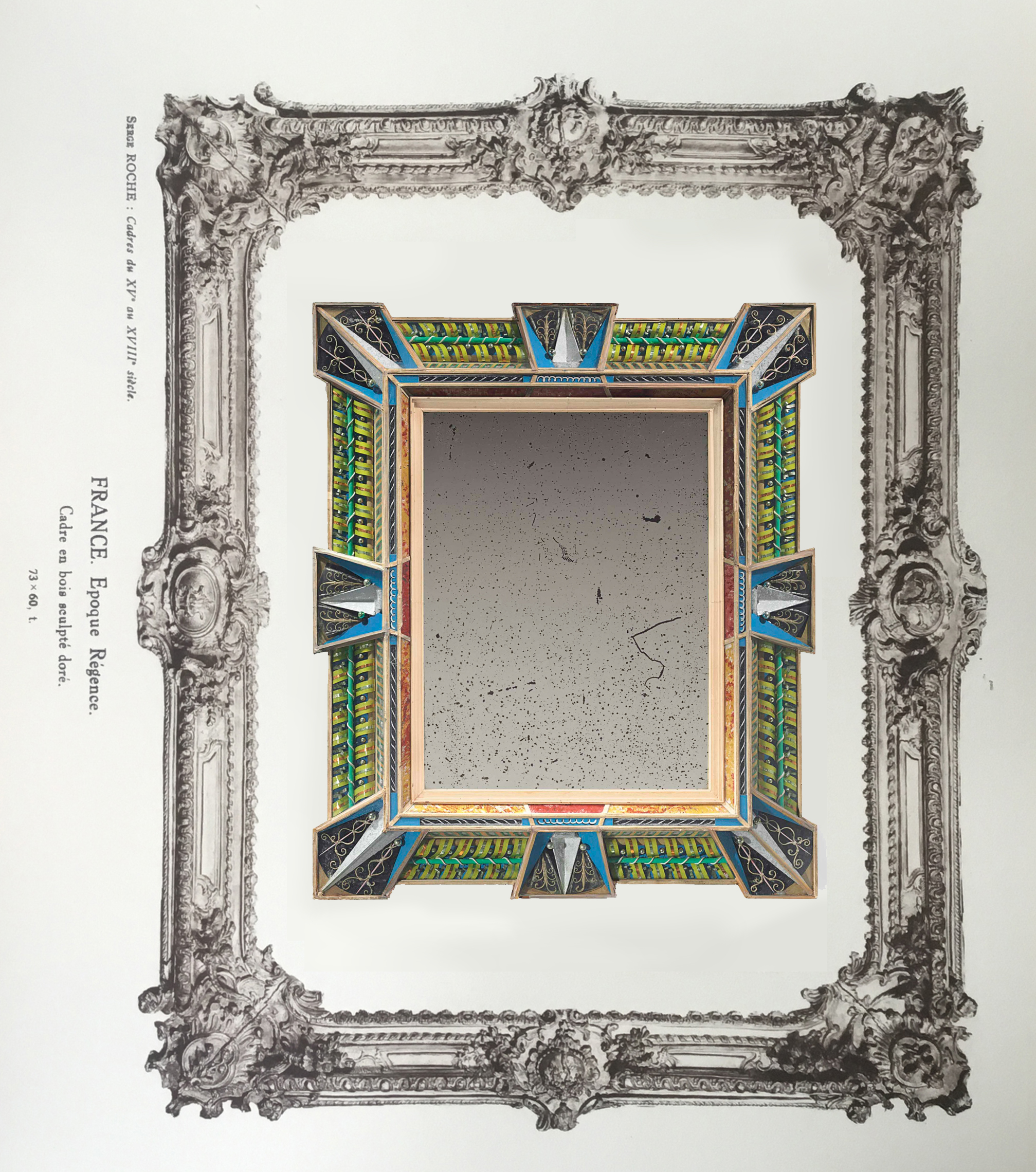 Likewise with this early 18th century Régence frame, its projecting corners arrowing outwards, and its parallel orders of decoration based around raked fluting and a twisted ribbon: dissect its ornament and simplify its curving forms to stylized geometric rhomboids and wedges, and this 1930s looking-glass frame emerges, to be coloured in bright acidic paints instead of soft gold.