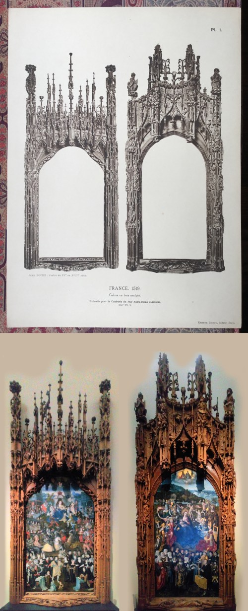 Altarpieces for the Confrérie du Puy Notre-Dame d’Amiens: Pour nostre foy militante comtesse, 1525; Pré ministrant pasture salutaire, 1519, Musée de Picardie; and Plate 1 of Cadres français et etrangers… : ‘1519; Cadres en bois sculpté; Exécutés pour la Confrérie du Puys Notre-Dame d’Amiens. 173 x 97, t.’