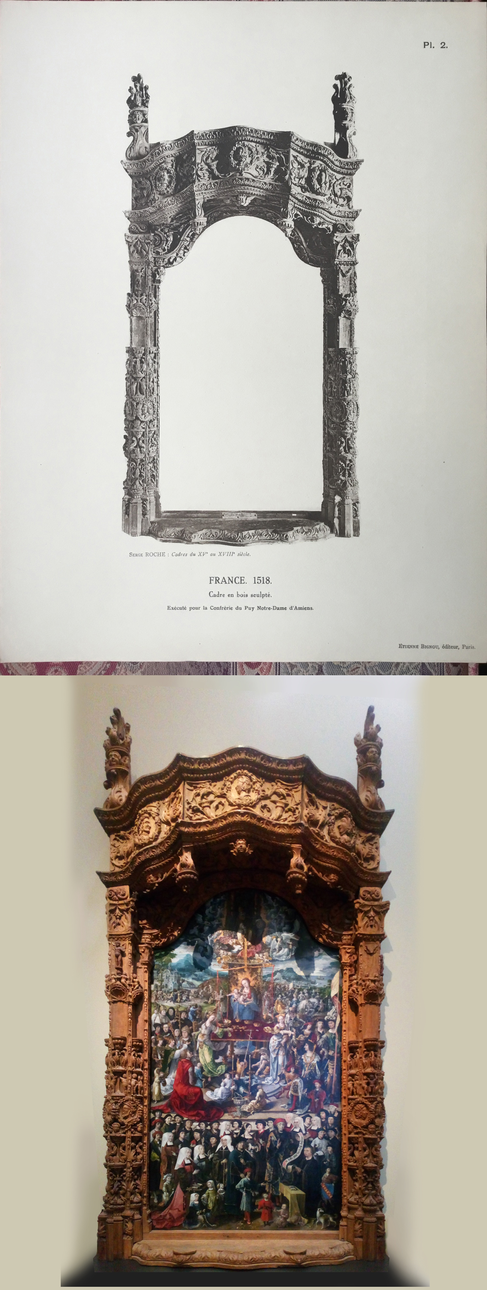 Altarpiece of Confrérie du Puy Notre-Dame d’Amiens: Au juste pois véritable balance, 1518, commissioned by Antoine Piquet, procureur for the king, Musée de Picardie; & Plate 2 of Cadres français et etrangers…: ‘1518; Cadre en bois sculpté; Exécuté pour la Confrérie du Puys Notre-Dame d’Amiens’