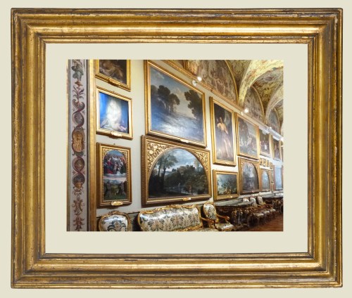 Lot 25 is a handsome example of the Roman gallery frame, the ‘Salvator Rosa’, shown above with a view of the Palazzo Doria Pamphilji, where it has been used for a mass framing of the collection. This way of displaying paintings (whatever their nationality and period) in more or less ornamented versions of the same frame meant that they were harmonized both with their architectural surroundings and with each other. The ‘Salvator Rosa’ is the epitome of a Baroque frame, manipulating strong contrasts of light and shade through its deeply-carved convexes and concavities. These emphasize the parallel lines of the mouldings and the way that they join at the mitres to produce the effect of a short perspectival tunnel, running into and focusing on the painting; this, in its turn, reinforces the compositional perspective and spatial recession of the image.