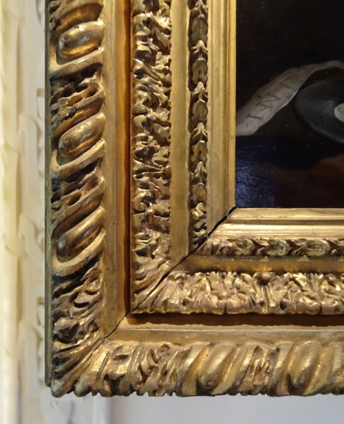 In their own time, the smaller versions of Louis XIV portrait frames surrounded the sitters with a wide margin of golden filigree lace, like this example: fitted at some point to a painting by Philippe de Champaigne by the addition of an extra carved sight edge, in order to keep the magical foil of precious, intricate, light-catching carving to offset the swathes of plain colour – crimson, black, Van Dyke brown.