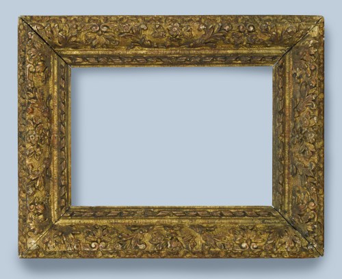 Lot 1: a fine French Louis XIII carved and gilded fruitwood frame, second half 17th century, 23.7 x 16.5 cm.; convex profile with flowered back edge; undulating sprays of leaves and berries, leaf buds, and sprigs of flowers on a hatched ground, with acanthus leaf corners; cavetto; ribbon-&-stave at sight edge; original gilding