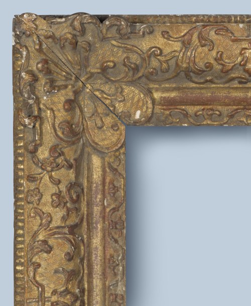 Lot 56: A fine provincial (southern) French Louis XIV-style carved giltwood frame, c. 1700, 97 x 143.5 cm.; made from poplar; convex profile; imbricated leaf at the back edge; delicate foliate C-scrolled decoration with leaf buds and floral sprigs on a cross-hatched ground; scrolling foliate projecting corners with leaves on a diapered ground; sanded frieze; panels of foliate ornament on the ogee at the sight edge; original gilding