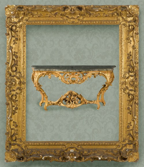 Lot 86: A mid-18th century French Rococo carved giltwood  frame; concave profile with cabochon chain at the back edge; S-scrolling rails; rocaille and cabochon corners; scrolling rocaille centres; trailing rinceaux in the hollow; sanded frieze; acanthus tip and leaf bud sight edge; 79.1 x 63.5 cm.; shown with Louis XV carved giltwood console, c. 1745, Sotheby’s, 18 May 2021, Lot 33