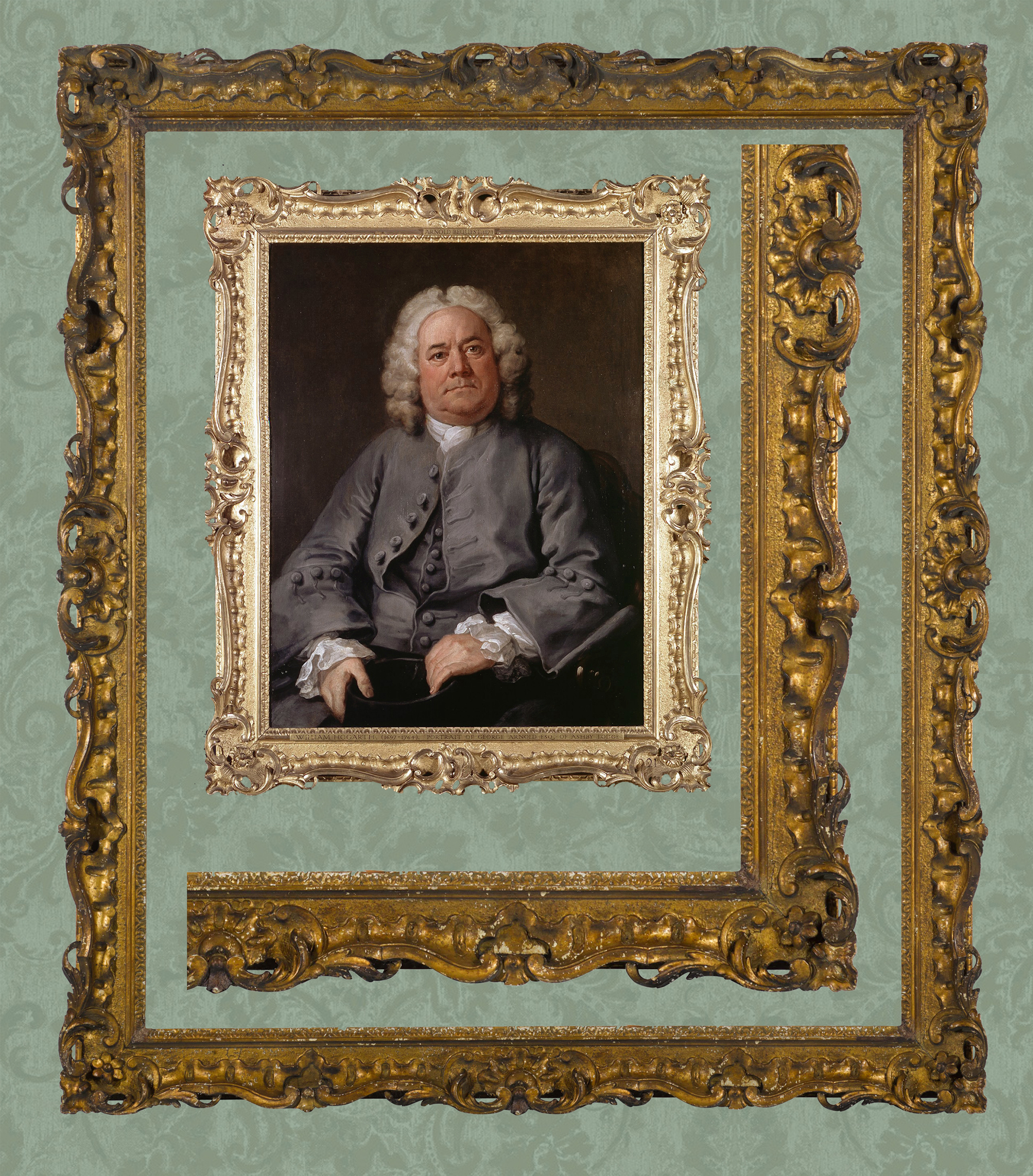 Lot 103: A British Rococo carved giltwood frame; concave profile; with foliate back edge; S-scrolling rails; pierced scrolling foliate corners with applied rosettes; scrolling foliate and rocaille centres; leaf bud demi-centres; rocaille in the hollow; sanded frieze; acanthus tip sight edge; 125.2 x 105.5 cm.; montaged with William Hogarth, George Arnold, 1738-40, 90.5 x 70.8 cm., Fitzwilliam Museum