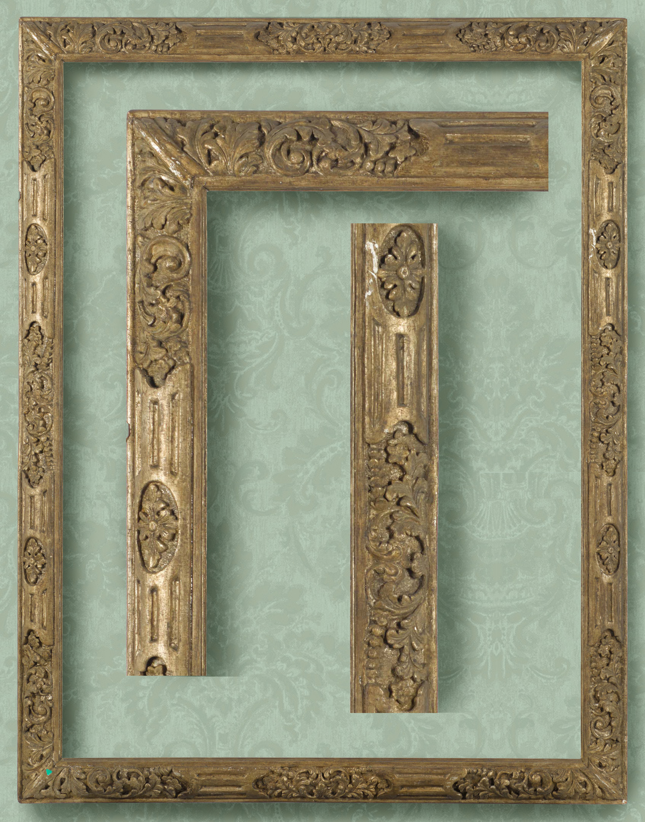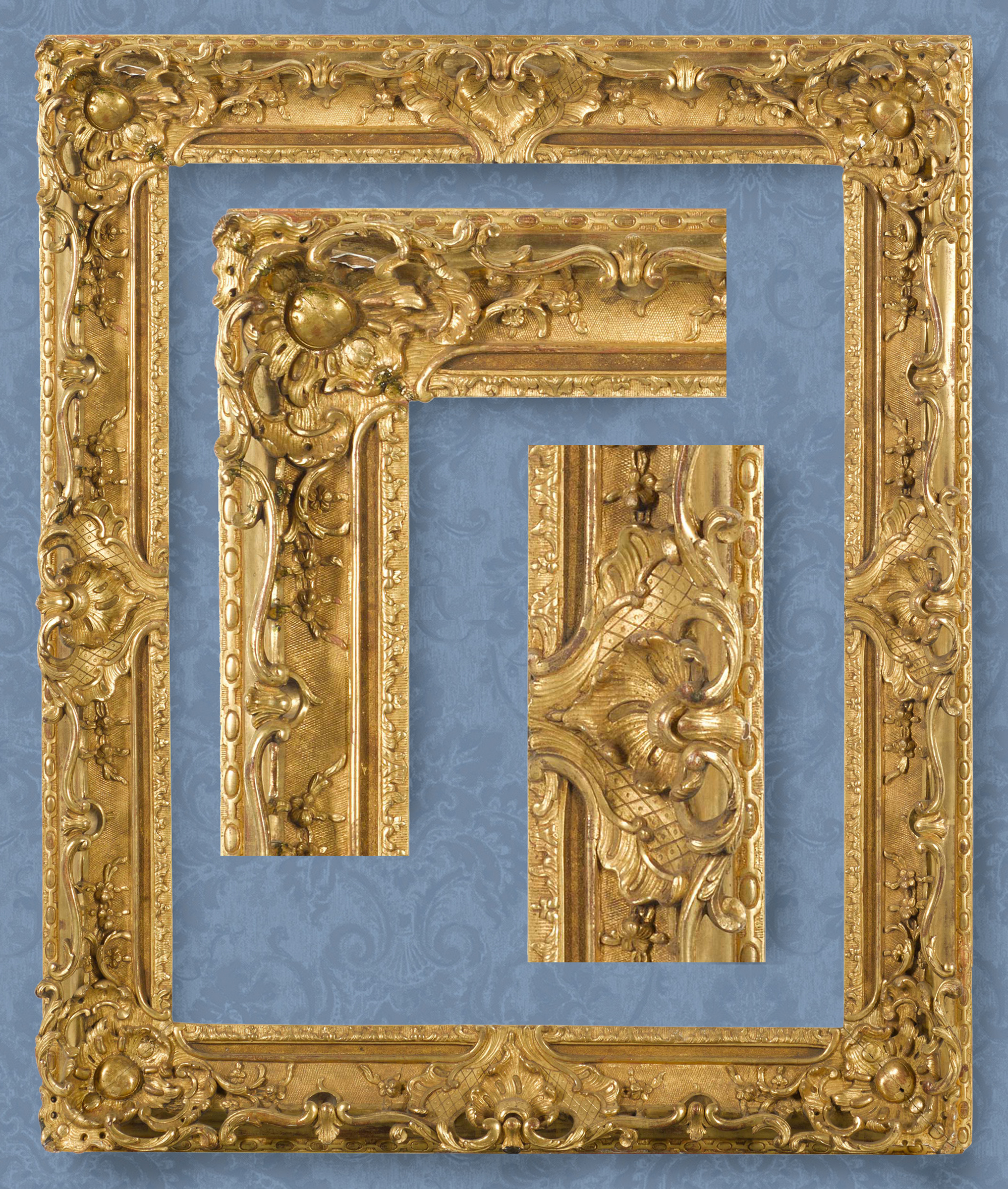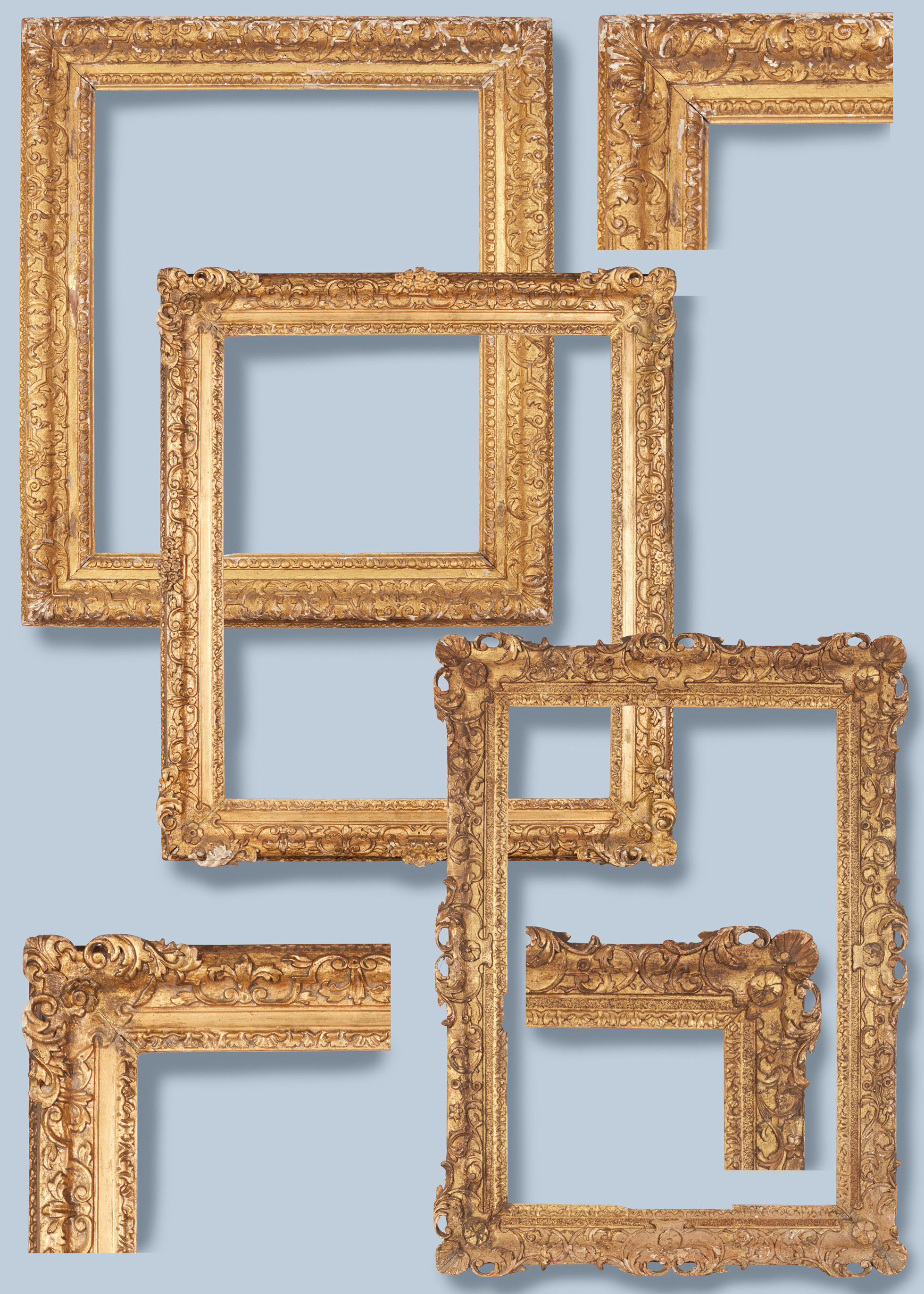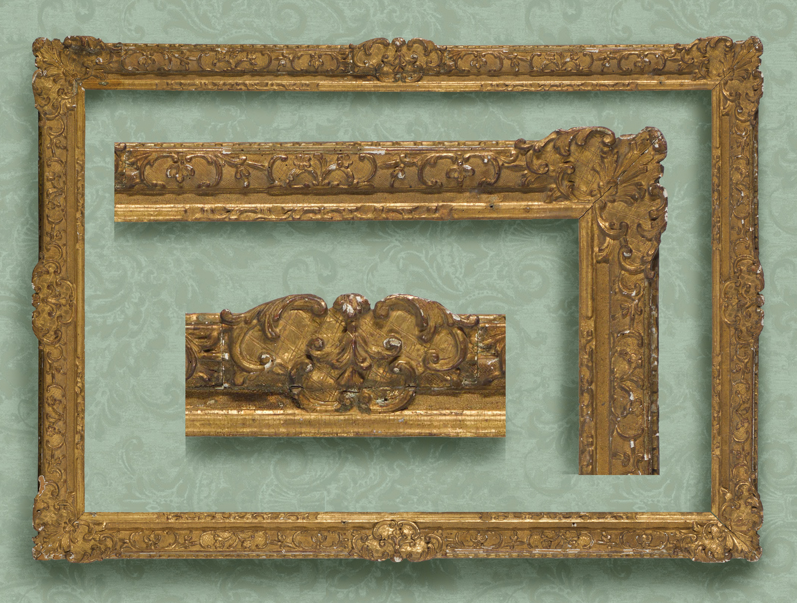 Lots 20, 22 and 21: British Baroque Louis XIV-style frames with ogee profiles: Lot 20: with scrolling foliate strapwork and leaf buds on a cross-hatched ground and acanthus leaf corners; frieze; egg-&-dart sight edge; 73.8 x 61.2 cm.; Lot 22: with flowered back edge; scrolling strapwork and leaf bud on the ogee, with foliate cartouche corners with rosettes;  plain frieze; acanthus tip and shell sight edge; 74 x 61.6 cm.; Lot 21: with scrolling foliage and florets on the ogee, with pierced foliate and shell cartouches with rosettes in the corners and centres;  sanded frieze; acanthus tip and shell sight edge; 75.8 x 49.5 cm.
